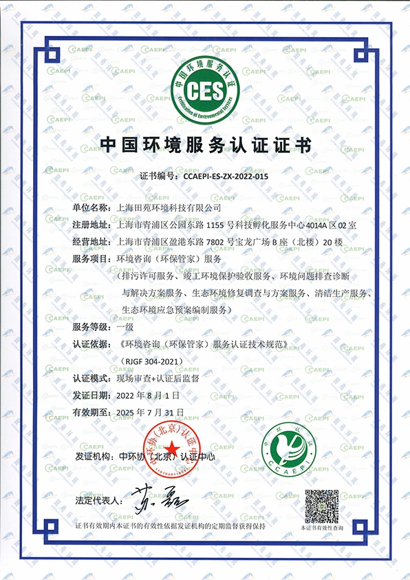 《中國(guó)環(huán)境服務(wù)認(rèn)證證書(shū)【環(huán)保管家一級(jí)】》